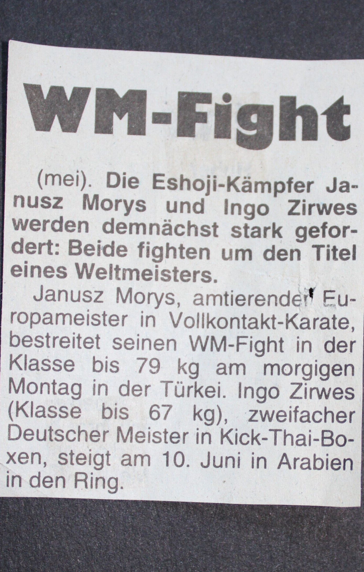 Janusz Morys, amtierender Europameister in Vollkontakt-Karate, bestreitet seinen WM_Fight am morigen Montag in der Türkei. Ingo Zirwes (Klasse bis 67 kg), zweifacher Deutscher Meister in Kick-Thai-Boxen, steigt am 10. Juni in Arabien in den Ring.